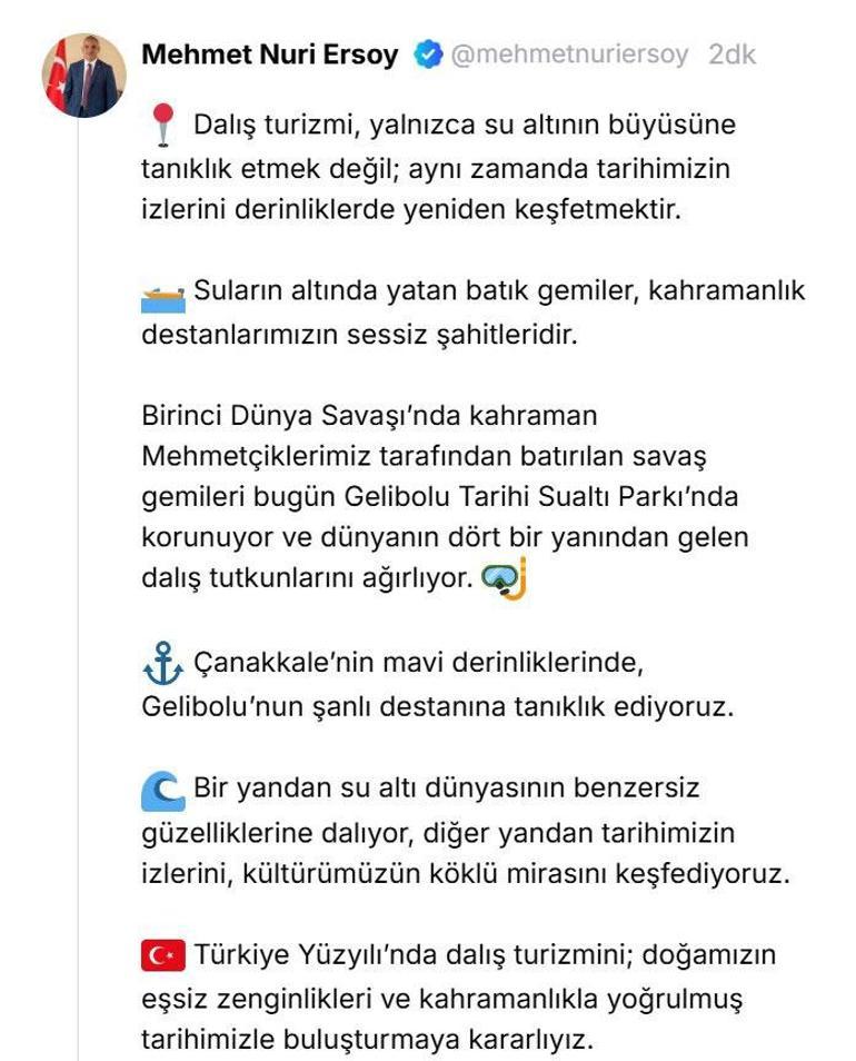 Kültür ve Turizm Bakanı Mehmet Nuri Ersoy, sosyal medya hesabından Gelibolu Tarihi Sualtı Parkı hakkında önemli bir paylaşımda bulundu.