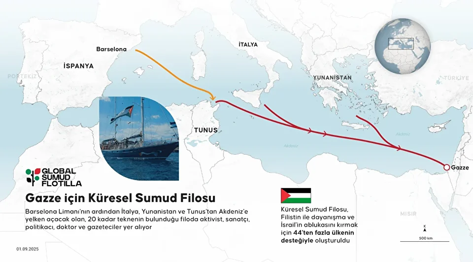 Filistin ile dayanışma ve İsrail’in ablukasını kırmak için 44’ten fazla ülkenin desteğiyle Küresel Sumud Filosu (Global Sumud Flotilla) adıyla oluşturulan uluslararası sivil yardım filosuna bağlı tekneler, 31 Ağustos’ta İspanya’nın Barselona kentinden Gazze’ye doğru yola çıktı.