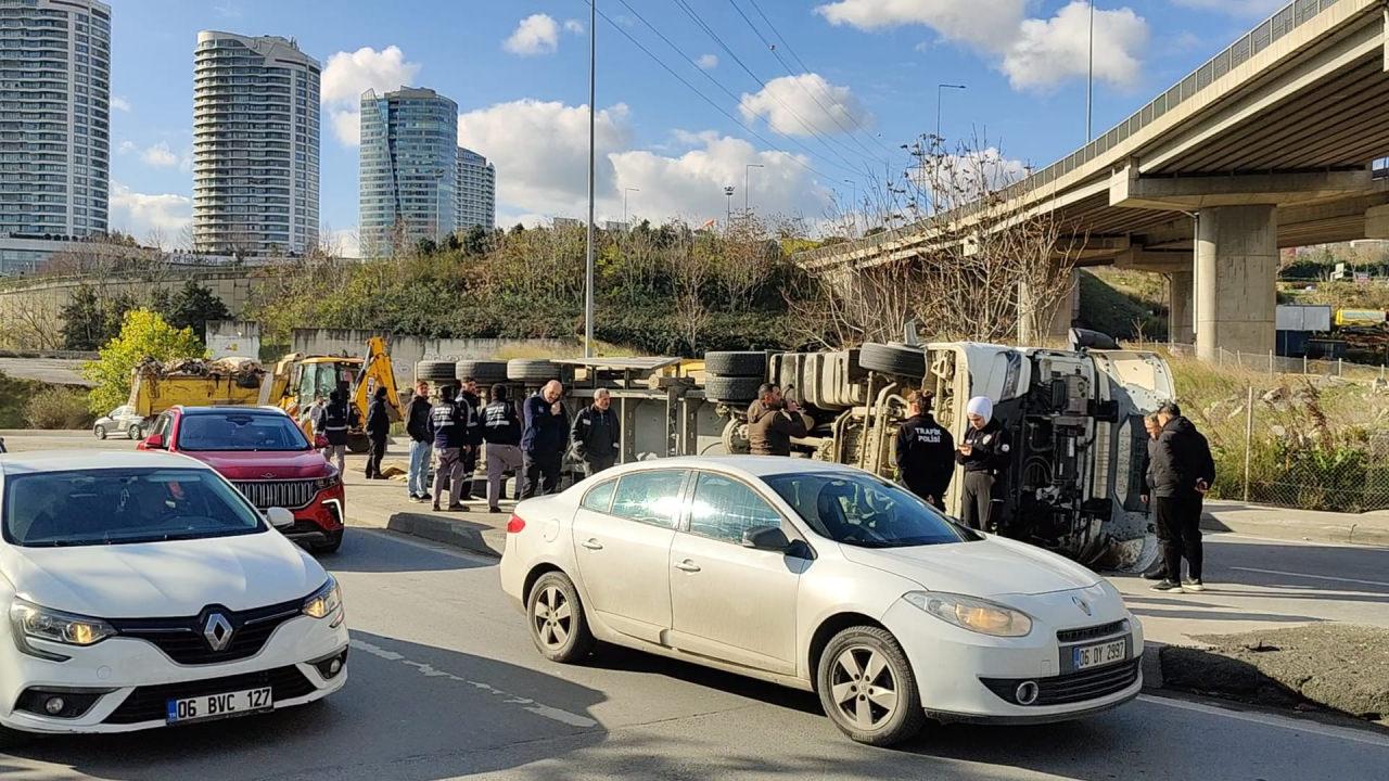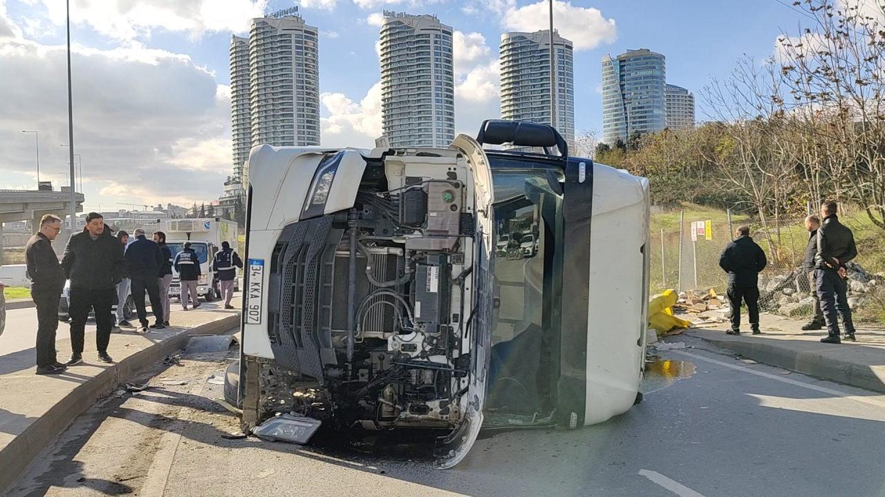 Başakşehir istikametinde seyir halinde 34 KKA 907 plakalı hafriyat kamyonu, şoförü Ahmet K.’nın direksiyon hakimiyetini kaybetmesi üzerine refüje çarpıp karşı şeride devrildi.