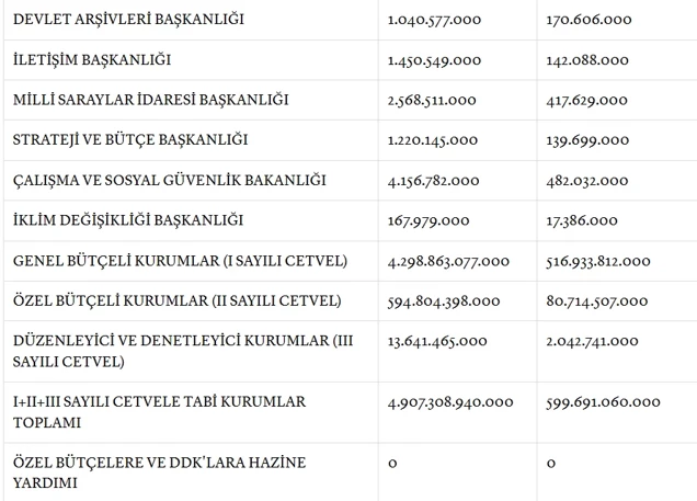 2026 bütçesinde kurumlar için öngörülen personel giderleri listesi şu şekilde: